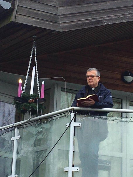 The Reverend Sean Larkin, a Goldworth Park resident, lit the first candle on 29 November, with many interested observers stopping on the path by the lake as the brief ceremony was conducted.