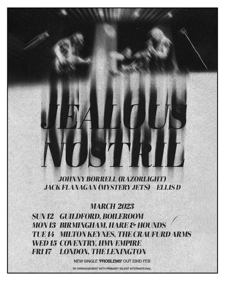 The Sutton-born singer has recruited Mystery Jets’ Jack Flanagan and DJ Ellis-D for his latest venture, with Borrell explaining of the new band name: “Jealous Nostril, a binary system… One is fulfilled, the other isn’t.”