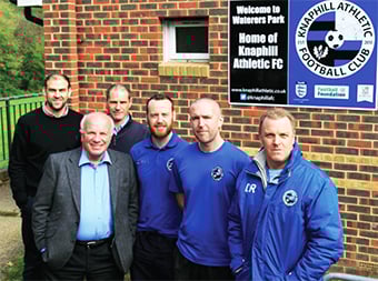 There to greet him at Knaphill’s Waterers Park home were Surrey FA Development Manager Paul Jones, Club Treasurer Kevin Barkham, Knaphill’s captain Edwin Doyle and manager Des Clark, and Chairman Dean Roberts.