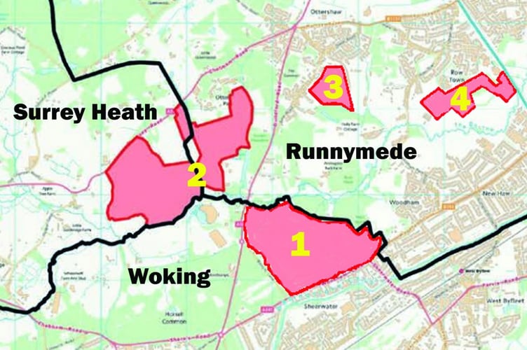 Paul Rimmer’s map showing possible housing development sites. They include: 1 Land east of Martyrs Lane; 2 Fairoaks Airport; 3 Ottershaw; 4 Row Town