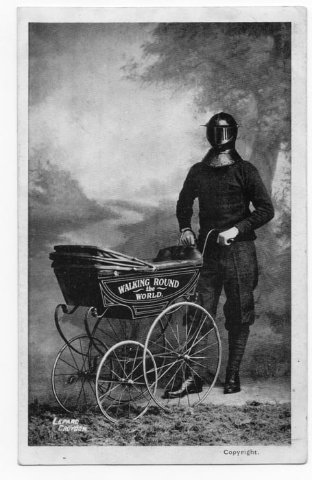 It said the wager was laid by an American millionaire, and among the conditions were that the man, Harry Bensley, should wear the mask in all public places and push the perambulator around the world, from which he sold postcards and pamphlets to fund his and his minder’s trip. Part of the deal was that he was to take a wife, and this he showed off when he came to Woking. Trouble was, he was already a bigamist!