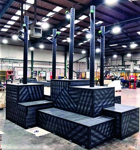 The company asked him to create an eye-catching, fire-ravaged forest sculpture made from Smartawood, its proprietary recycled plastic lumber. Smartawood is used to make a wide range of outdoor furniture and building material.