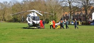 A MAN who fell from the top of The Peacocks multi-storey car park in Woking town centre last week is pictured being wheeled on to the Kent, Surrey & Sussex Air Ambulance on Wheatsheaf Common. He was flown to St George’s Hospital in South London, where he died earlier this week.