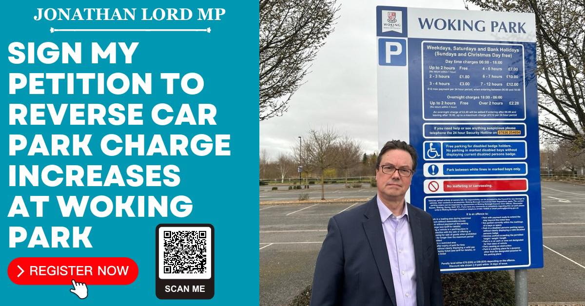 WOKING MP Jonathan Lord’s petition to reinstate three hours of free parking at the Woking Park car park has reached the 400 signatures required for it to be heard at a meeting of the borough’s Full Council.