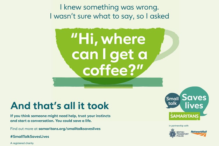 Samaritans – the charity organisation with trained listening volunteers available 24/7 to respond to calls for help – is running a campaign in partnership with Network Rail and British Transport Police called Small Talk Saves Lives – see samaritans.org/small-talk-saves-lives