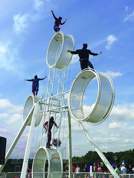 The main attraction in the arena tomorrow is the Vander Brothers Space Wheel – four large drums on a central spindle on which “superhero” acrobats will perform stunts.