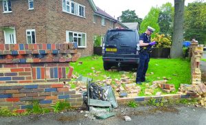 RESIDENTS of a quiet Maybury road got a shock when a stolen vehicle crashed through their front garden wall.