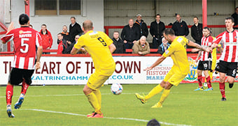 A sharp shower at kick-off made for some slick conditions early on, with busy Alty keeper Stuart Coburn spilling slippery strikes from Conference top-scorer Scott Rendell and the ever-versatile John Goddard from tight angles.