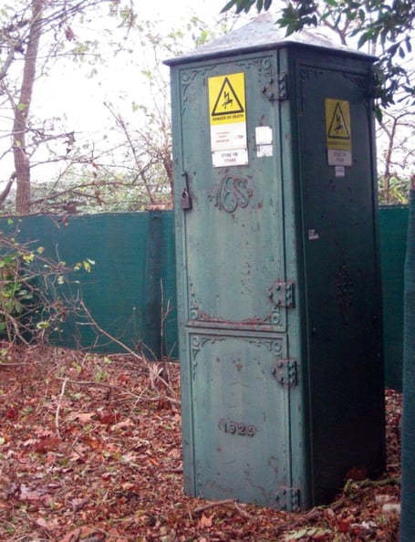 A transformer with the letters ‘WES’ on its door and with a date of 1924 is adjacent to Stone Farm, Church Hill, Pyrford.