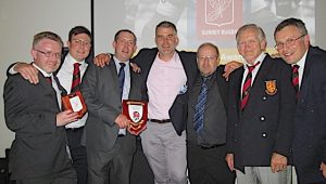 Long-serving second row Jon Hursthouse, in the absence of first XV captain Michael Aitchison, was first up to receive Woking’s Surrey 4 trophy from former Harlequins and England number 8 Nick Easter, who was born in Epsom.