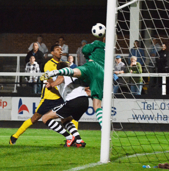Gavin McCallum's whipped corner fell to the former Welling man inside the six-yard box and only a combination of keeper Dan Hanford, Stefan Stam and Harry Pell was able to stop the ball going over the line.