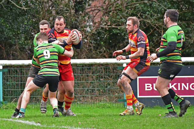 REEL: Chobham RFC, scarlet and gold, lose 55-31 at home to Grasshoppers in Regional Two Thames on February 3, 2024.