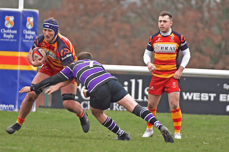REEL: Chobham RFC, scarlet and gold, lose 54-17 at home to Belsize Park on January 13, 2024.